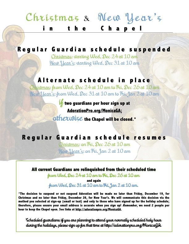 https://adorationpro.org/monicaga The regular Guardian schedule will be suspended over the Christmas and New Year’s holidays. As in the past, the chapel will remain open for Adoration if two people per hour sign up on the alternate...